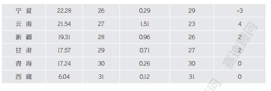 除了高出GDP排名的,也有DEDI综合指数排名明显落后于GDP排名的省份。如内蒙古、河南、广西和河北四个省(自治区),分别落后9个、7个、5个、5个名次。