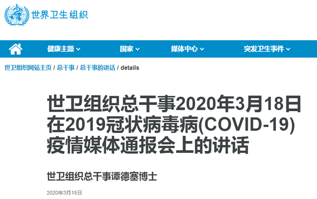 以下是世卫组织总干事谭德塞3月18日在新冠病毒疫情媒体通报会上的讲话: