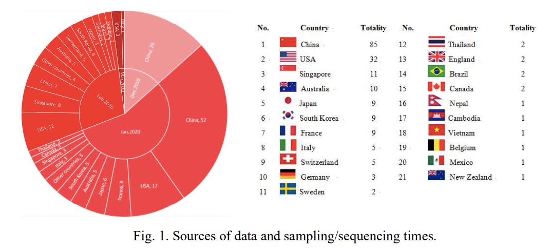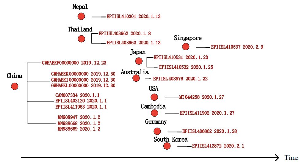 图5.第一代COVID-19毒株的国家、序列号和测序日期。