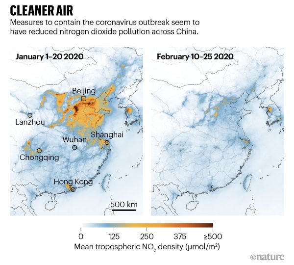 第三张图展示了旅行限制对碳排放和空气质量的影响。中国为控制疫情所做的努力似乎已经遏制了能源消耗和空气污染。NASA和欧洲航天局收集的卫星数据显示,全国范围内大气中二氧化氮(NO2,是化石燃料燃烧过程中产生的)含量急剧下降。初步分析表明,农历新年后的NO2污染比往年同期减少了10–30%。