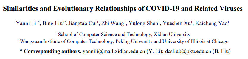 西安电子科技大学教授李雁妮等人和北京大学讲席教授刘兵发表了一篇关于新冠病毒全基因序列相似性的研究,题为“Similarities and Evolutionary Relationships of COVID-19 and Related Viruses”(COVID-19与相关病毒的相似性及其进化关系)。