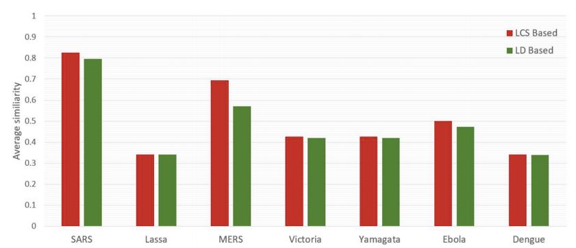 图3. COVID-19与七种致命的致病性P3 / P4病毒序列之间的平均相似度。