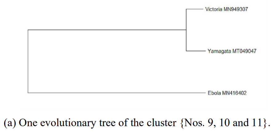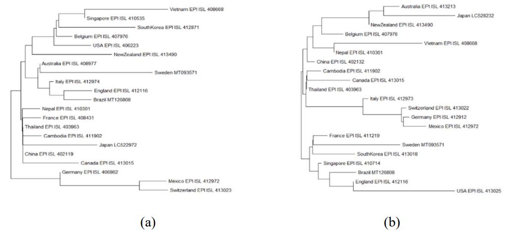 图6.来自21个国家的21个COVID-19病毒株的两棵进化树(每个国家一个毒株)。