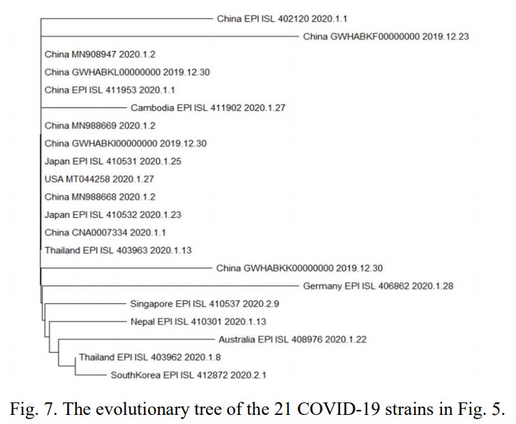 6. 采用MEGA 6.0对来自21个国家的共计194个宿主为人的新冠病毒COVID-19序列同源进化关系的计算结果表明:来自5个国家的13株病毒序列,即:中国(China 7/85)、泰国(Thailand 2/2)、日本(Japan 2/9)、美国(USA 1/32)和韩国(South Korea 1/9)极有可能相关于,或导致我们找到第一代病毒或病毒源。值得注意的是,由于存在世界范围内的旅行,本文决没有上述来自5个国家的13株病毒序列一定/可能是病毒源国之意,仅表明,这13株病毒序列为我们可能追溯查找到第一代病毒或病毒源提供了必要有价值的线索。