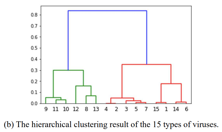 本文工作中,作者共收集了公开发布的215个COVID-19全基因序列(包括:宿主为人的194个序列、宿主为菊头蝠的13个序列、宿主为穿山甲的6个序列,以及宿主为环境的2个序列),已有的四种流感冠状病毒HCov-229E (3个) , HCov-OC43 (78个), HCov-NL63 (16个) 和 HCov-HKU1 (4个), 以及7种高致病致命的7种 P3/P4病毒, SARS (11个)、MERS (11个)、Victoria (5个)、 Lassa (6个)、Yamagata (5个)、Ebola (11个)和Dengue (12个),以上序列总计377个。本文的序列数据来源于以下数据库:GenBank or NCBI[7] (National Center for Biotechnology Information), GISAID[8] (Global Initiative on Sharing All Influenza Data), CDC[9](Center for Disease Control and Prevention)等,序列的平均长度为3万左右。