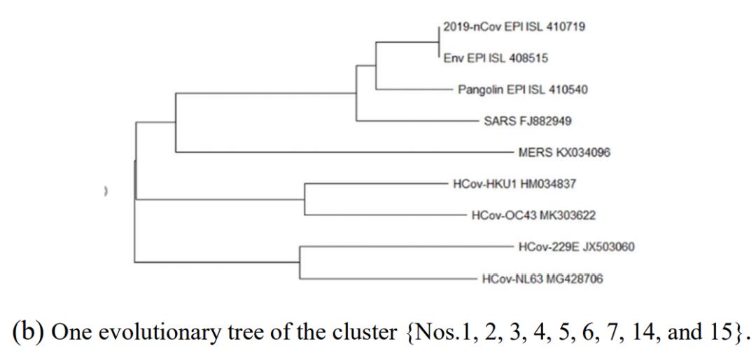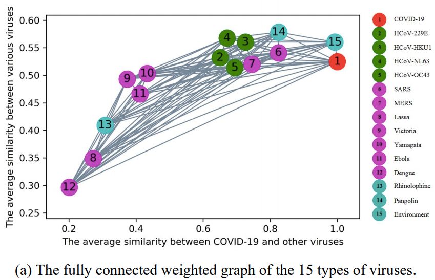 相似性分析表明,两株以菊头蝠为宿主的COVID-19病毒(TG13和 RaTG13)与以人为宿主的COVID-19病毒有很高的相似度,但以穿山甲为宿主的病毒与以人为宿主的病毒平均相似度更高一些。进化关系分析表明:来自5个国家所测序的约13株COVID-19病毒很可能与第一代COVID-19病毒及其起源有关,或可能引导研究人员找到该病毒源头。