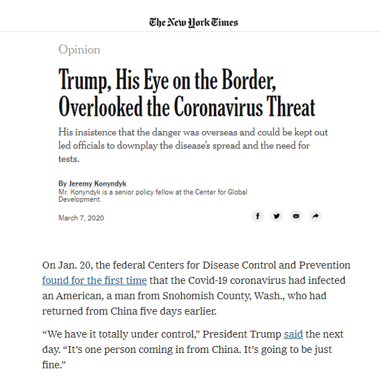 但从《纽约时报》等美国媒体的文章来看,这个病例因为是从武汉回来的,所以没有引起美国政府的足够重视。美国政府还在2月很长一段时间里都坚持认为,病毒来自中国和国外,本土的威胁很小,可防可控。