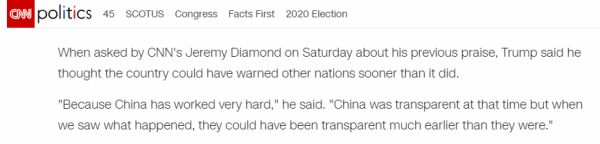 甚至于,CNN的一名记者还在特朗普的发布会现场专门拿此事质问了特朗普,特朗普只得找补说:“中国当时很透明,但如果他们再早一点透明就好了”。