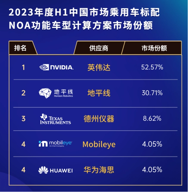 而随着征程5在多款爆款车型上实现大规模量产出货,地平线也在加速领跑高阶智驾市场。高工智能汽车研究院数据显示,今年上半年的NOA计算市场,英伟达与地平线两家公司合计占据超过八成的市场份额。并且,地平线在量产车型数量上高于英伟达,是唯一一家NOA量产车型超过20家的计算方案商。