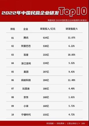 导读:“民营企业500强”持续加大研发投入力度,研发投入金额排名前十的企业分别为腾讯、阿里巴巴、百度、浙江吉利、美团、蚂蚁科技、比亚迪、京东、小米、宁德时代。其中,百度、蚂蚁集团、腾讯研发强度超过10%,位居民营企业研发费用十强中的前三位。