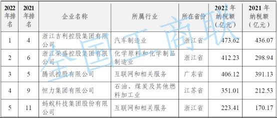 在税收、社会责任投入等方面,民企也在参与支持社会发展。《报告》显示,2022年,纳税额前五位的500强企业分别是浙江吉利、浙江荣盛、腾讯、恒力集团、蚂蚁集团,五家企业的纳税额均超过了200亿元。其中,蚂蚁集团2022年纳税额较2021年增加了53亿元,排名较2021年上升了6位。