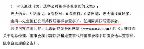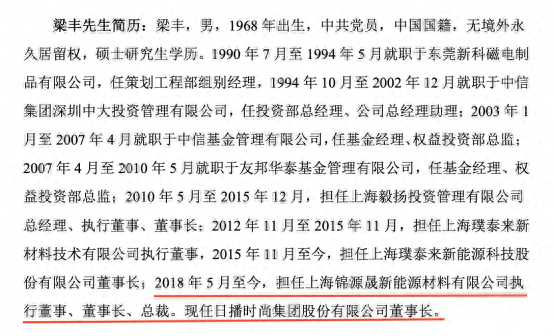 9月28日,日播时尚发布高管人员任职变动公告,由梁丰担任公司第四届董事会董事长,任期同第四届董事会。2015年至今,梁丰担任上海璞泰来新能源科技股份有限公司(下称璞泰来)董事长;2018年至今,担任上海锦源晟新能源材料有限公司(下称锦源晟)董事长。