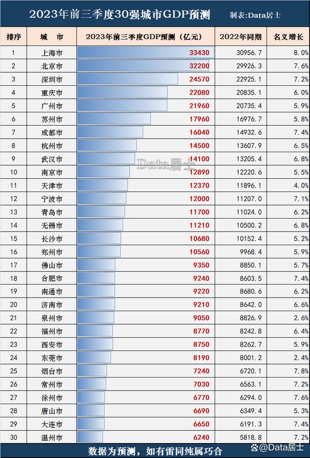 全国30强城市2023年前3季度GDP预测:北上强势回升,成都也会较快