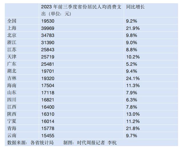 与此同时,各省也陆续发布了前三季度的“成绩单”。时代周报记者梳理发现,截至10月29日,已有16个省份公布了前三季度居民人均消费支出数据,7个省份前三季度人均消费支出超过全国平均水平。