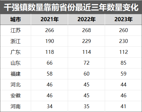 时代周报记者翻阅最近3年全国千强镇名单发现,从各省份千强镇占有席位来看,江苏、浙江、广东站稳前三强,三者千强镇之和占到全国六成。