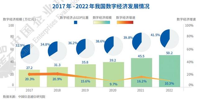 在经济企业的引领带动下,我国数字经济发展取得新突破。2022年,我国数字经济规模达到50.2万亿元,同比名义增长10.3%,已连续11年显著高于同期GDP名义增速,数字经济占GDP比重达到41.5%,这一比重相当于第二产业占国民经济的比重。