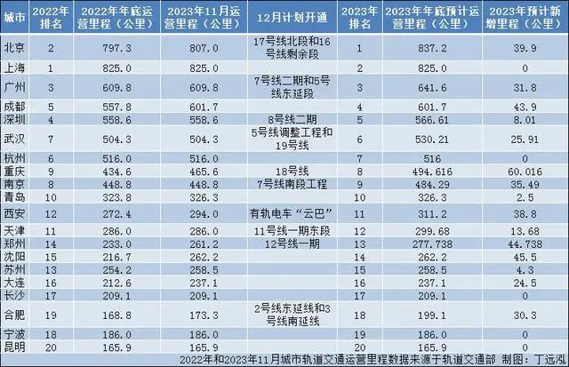与2022年的城市轨道交通运营数据相比,2023年11月的数据加上计划在12月开通的线路后,城市轨道交通运营里程排名前20的城市中,北京将超过上海,重回第一,成都、武汉、重庆、西安、郑州、沈阳、合肥的排名也前进一位。