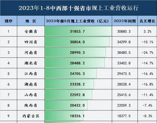 中西部工业十强省最新排名:安徽成为榜首,河南增速垫底
