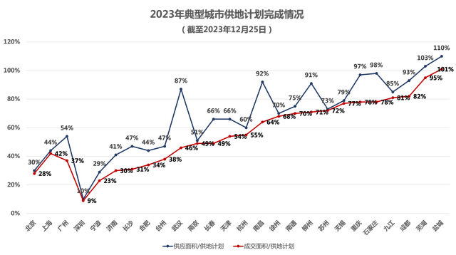 据克而瑞统计,截至2023年12月25日,26个典型城市供地计划平均完成率为45%,北上广深等9个城市完成率在平均值以下,其中深圳完成率仅为9%。