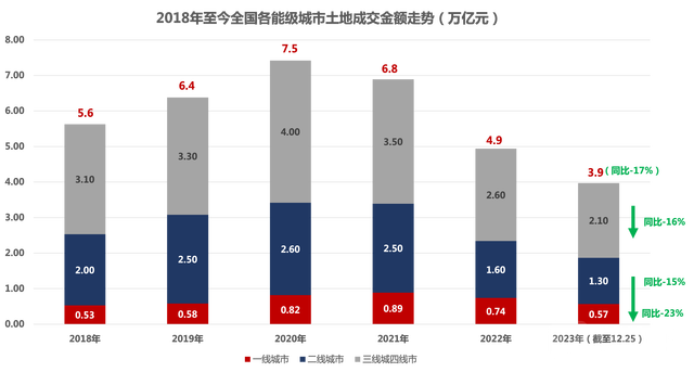 据克而瑞统计,2023年截至12月25日,全国300城土地成交金额3.9万亿元,较2022年同期减少17%。与土地成交规模变动走势一致,成交金额较去年同期也明显收缩,同比降幅持续高位。分能级结构来看,各能级城市的成交金额也均表现为同比走低。其中一线城市成交降幅最突出,成交0.57万亿元,同比降幅高达23%;二线城市成交1.3万亿元,同比减少15%;三四线城市成交2.1万亿元,同比减少16%。