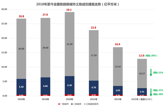 据克而瑞统计,2023年截至12月25日,全国300城土地成交建面12.8亿平米,较2022年同期环比减少20%。在土地市场持续遇冷下,总成交规模位居近十年低位。分能级结构来看,受市场大环境遇冷,各能级城市土地成交面积均不及去年同期水平。其中一线城市成交0.27亿平米,同比减少30%;二线城市成交2.41亿平米,同比减少17%;三四线城市成交10.17亿平米,同比减少21%。