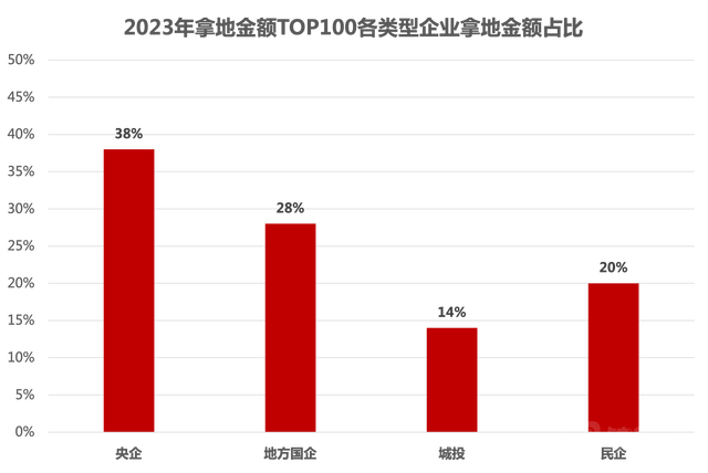 从克而瑞统计的拿地金额TOP100企业来看,国央企是土地市场绝对主力,央企2023年拿地金额占百强比例接近四成,与地方国企合计占比达到66%,城投、民企则分别仅有14%和20%。