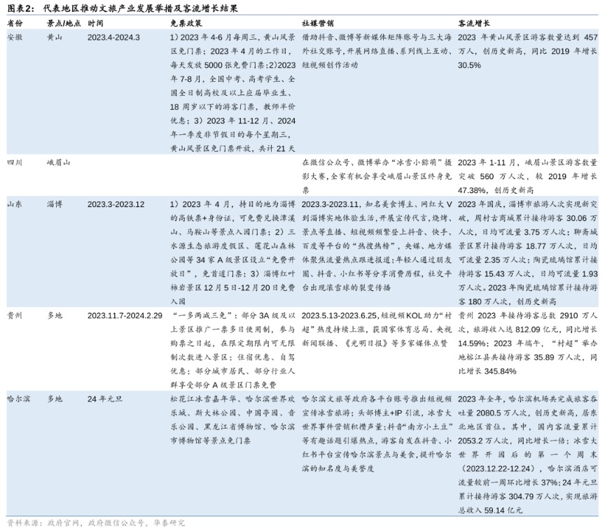 积极运用新媒体宣传营销是迎合年轻人偏好,实现哈尔滨旅游出圈的重要因素之一。东三省文旅局长“代言家乡”视频直播,与广西等南方省市局长喊话互动,有效拉动全国文旅及相关产业交流协同。据广西省商务厅1月8日数据,两地互动使得广西砂糖橘采购热度同比上涨逾23%。参考1H23“淄博烧烤”出圈带动山东旅游热,贵州两大乡村赛事IP拉动当地旅游,我们认为由政府牵头,以地方IP为阵地的文旅产业新模式已初具雏形,后续或有更多小众目的地借势出圈,释放旅游经济乘数效应,催生主题性投资机会。