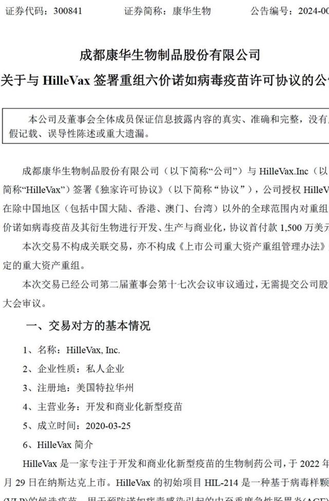 1月8日晚间,康华生物发布公告称,其与HilleVax.INC(以下简称“HilleVax”)签署重组六价诺如病毒疫苗许可协议,授权HilleVax在除中国地区(包括中国大陆、香港、澳门、台湾)以外的全球范围内对重组六价诺如病毒疫苗及其衍生物进行开发、生产与商业化,协议首付款1500万美元。
