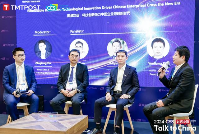 展会第二日,钛媒体集团科技3C事业部资深编辑杜志强作为主持人,与安吉尔集团副总裁赵凯、BOE(京东方)高级副总裁、显示器件及物联网创新业务中台技术与产品中台负责人刘志强、海信激光显示研发中心副总经理田有良一起,进行了“科技创新助力中国企业跨越新时代”为主题的圆桌讨论。
