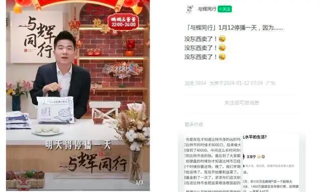 这种事情发生在董宇辉身上。1月12日,@与辉同行公众号发文称,停播一天,因为没东西卖了。#与辉同行因没东西卖停播一天#的话题,还冲上了热搜,在榜上挂了大半天,目前阅读数是1.1亿。