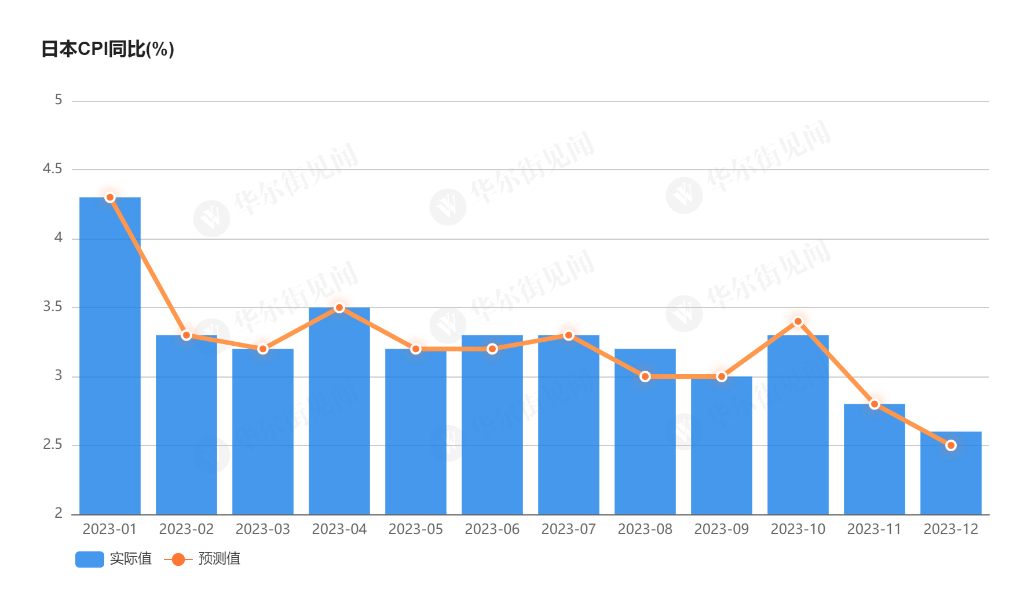 周五,本内务省统计数据显示,日本2023年12月CPI同比上涨2.6%,略高于预期2.5%,但较11月的2.8%小幅回落。另外,扣除新鲜食品的CPI同比上涨 2.3%,持平预期,低于前值2.5%。这两项数据均为连续第二个月回落。