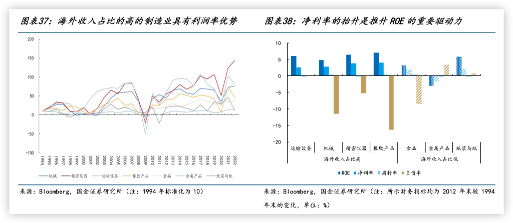 事实上,我们观察两组数据也可以得出同样的结论:一是我们挑选出制造业内部出海收入占比高的行业与占比低的行业以观察两者利润率的变化趋势,海外收入占比高的行业(如精密仪器)比海外收入占比较低的行业(如纸浆与纸)具备相对优势;二是进一步拆分“失落的20年”中制造业类行业ROE抬升背后的驱动力,也会发现净利率是绝对重要的贡献力量。