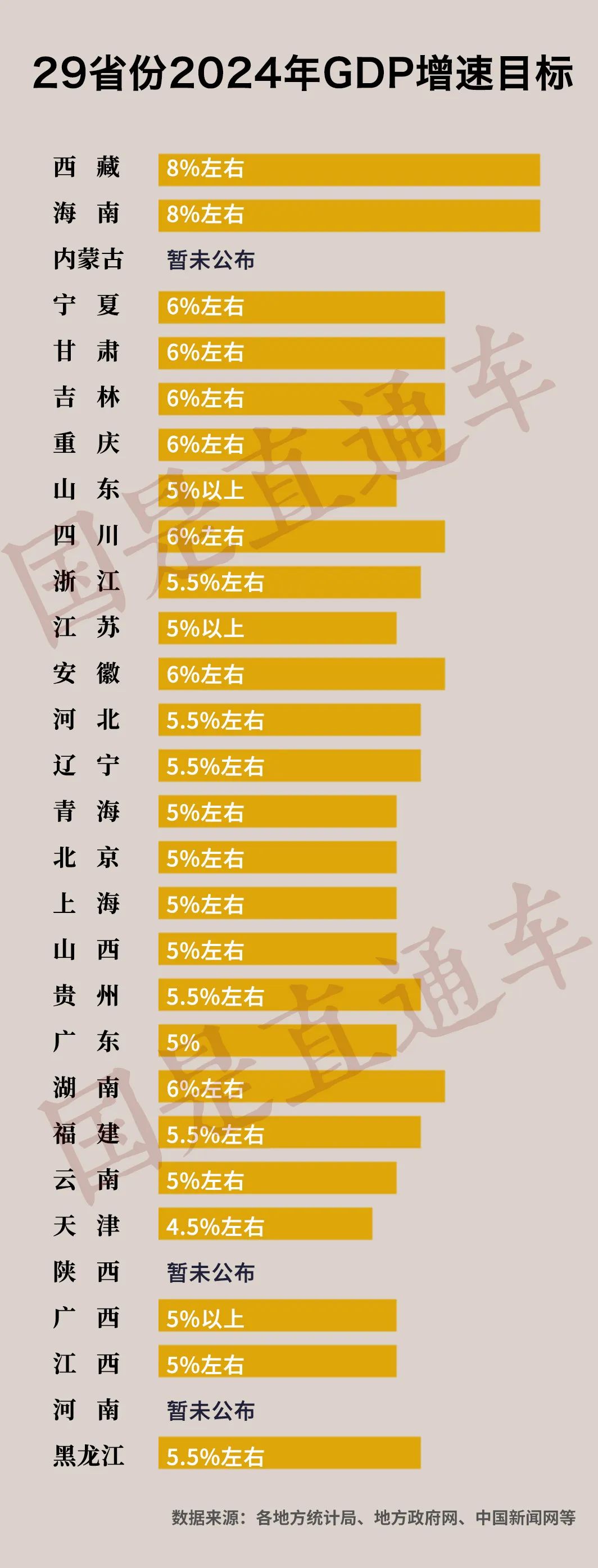 截至目前,2023年GDP增速最快的两个省份西藏和海南,今年的增速预期也最高,均为8%左右。其他已披露数据的省份大多将经济增长的区域目标落在5%-6%这一区间。