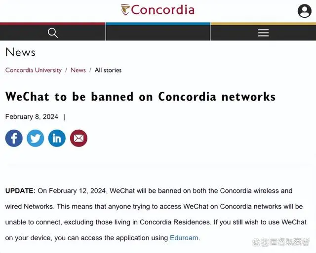 注意!近日,蒙特利尔康考迪亚大学(Concordia University)突然在官网发布通知,宣布校园网络禁止使用微信。
