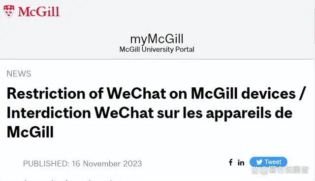 去年11月16日,蒙特利尔麦吉尔大学也在其网站上发声明表示,禁止在麦吉尔管理/拥有的任何设备上从应用程序或Web浏览器安装和使用微信,包括台式机和笔记本电脑、手机和平板电脑。