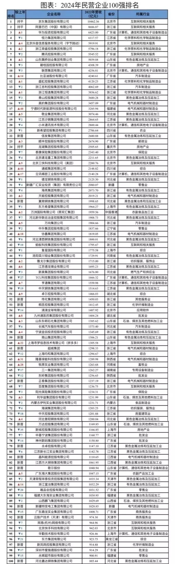 2024年民营企业100强发布:京东稳居第一 华为第三