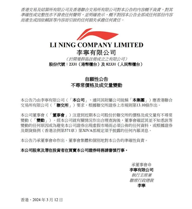不过,李宁随后发布公告称,公司董事会注意到近期本公司股份于联交所的价格及成交量有不寻常变动。“经本公司就有关情况作出合理查询后,董事会确认其并不知悉该等变动的任何原因”。
