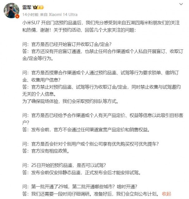 官方是否会针对个别用户或个别公司享有优先购买权可优先提车?雷军称官方没有相应政策。发布会前仅安排静态品鉴,正式发布会后才能安排试驾。此外,第二批开通的城市还需要一段时间仔细调研后公布。