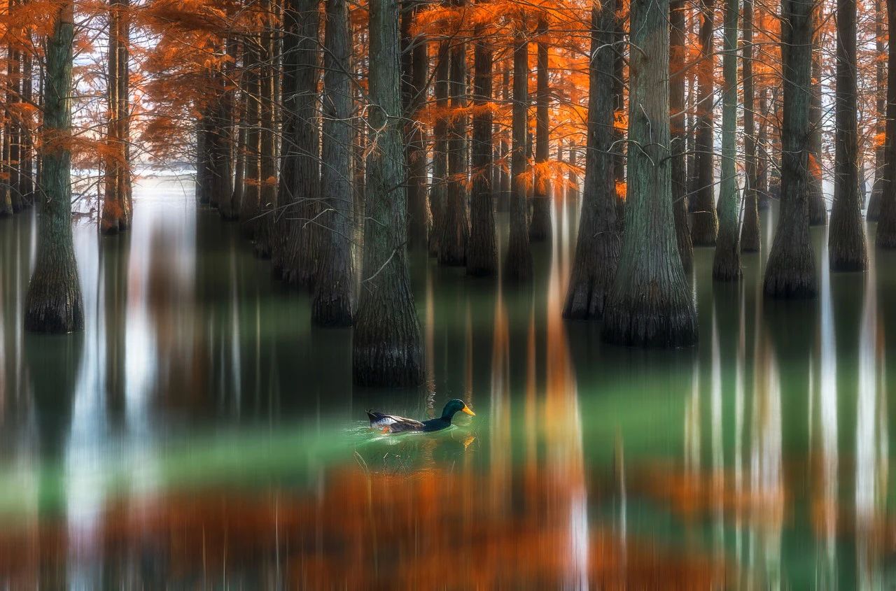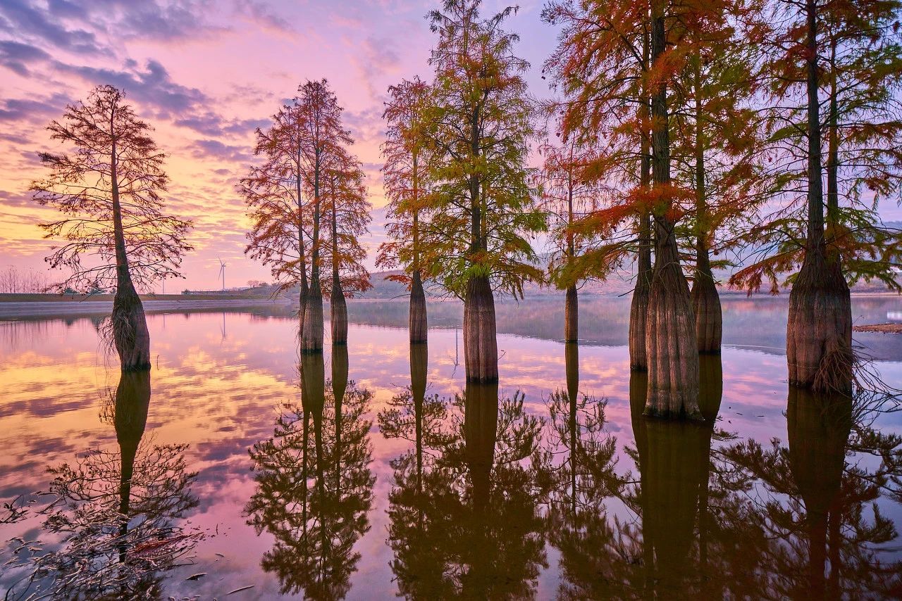 池杉披上暗绿和朱红相间的外衣,在夕阳下格外的壮丽,那犹如油画般的色彩从上至下过度渲染到湖里,美到令人窒息。