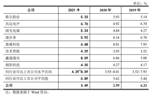 既然要走创新之路,必然离不开研发,我们来看天键电声在研发方面的投入,2019年、2020年和2021年,发行人与同行业可比上市公司的研发费用率对比情况如下表一所示,报告期内发行人的研发费用率分别为6.33%、2.59%、3.49%,而同行业可比上市公司平均值为5.44%、5.62%以及5.89%,2021年瀛通通讯的研发费用率则是达到了8.59%。由此可以看出发行人在研发方面的投入并不高,2020年研发费用率甚至不到行业平均水平的一半。