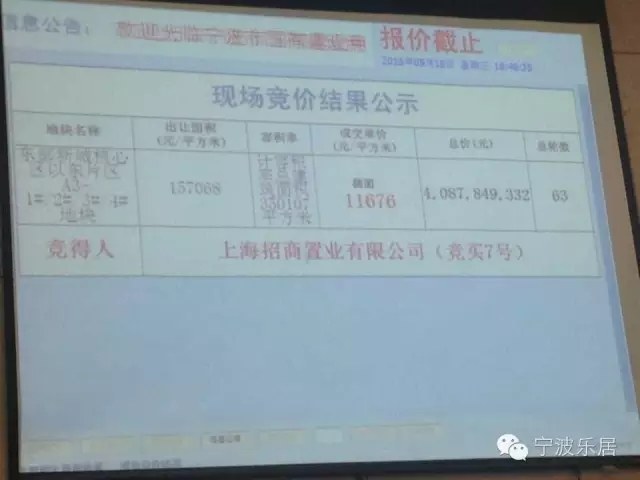 由于竞拍时间太长,不得不中途休息,相约饭后再战。最后几轮更是10元、10元地加码。经过近5小时鏖战,竞拍一直进行到第63轮,最终以最高报价11676元/平米结束!招商置业宁波公司以总价约40.88亿元竞得该地块,溢价率46.57%,成为宁波的“总价地王”!