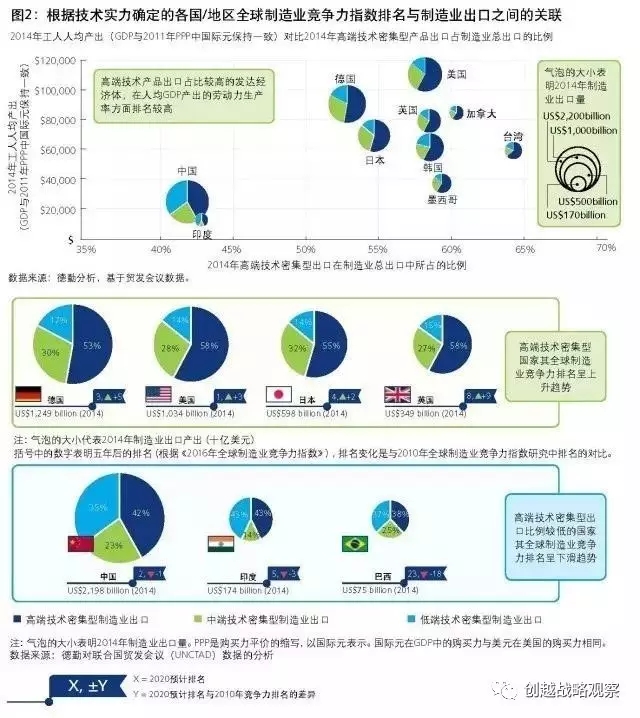 高、中、低端制造业的出口分析清楚地显示,高端技术密集型产品出口占德国、美国、日本和英国的总体制造业出口的绝大部分,自2010年以来,这几个国家制造业竞争力排名一直在上升。此外,这些高端技术出口占比较高的国家,人均 GDP产出的劳动力生产率排名也很高(见图2)。