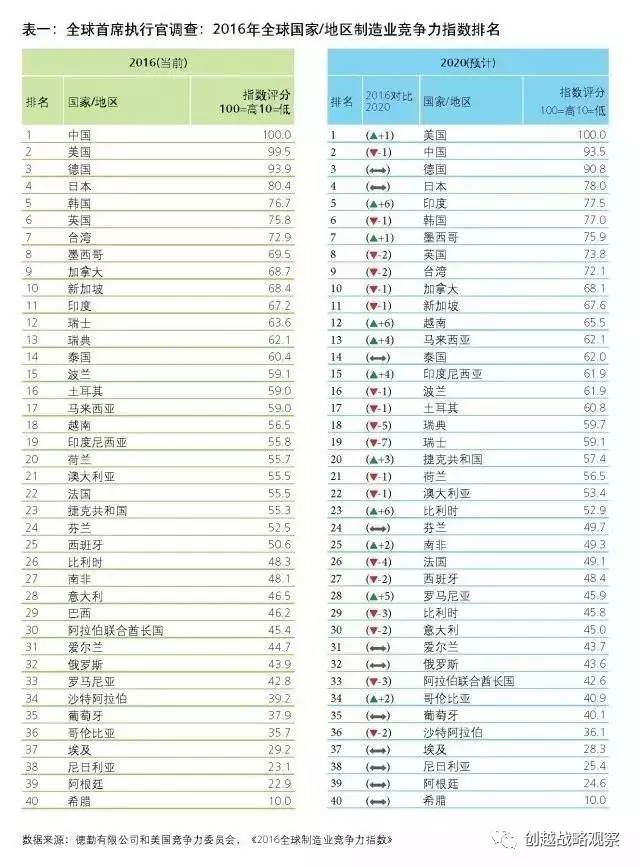 在今年的研究中,受访的企业首席执行官被要求按当前和未来的制造业竞争力对国家进行排名(见表一)。排名靠前的国家,在制造业卓越性的多重驱动因素方面均表现出优势。他们也清楚地表明制造业竞争力和创新之间存在着紧密的联系。2016年的研究密切关注了焦点六国:美国、中国、日本、德国、韩国和印度。总体来说,这六国占世界制造业GDP 的60%,显示了这六国对全球制造业趋势的影响地位。
