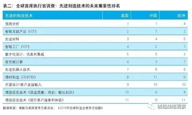 中国今年蝉联制造业竞争力排名第一名,不仅仅因为其传统的低成本价值主张,还因为中国创新基础设施的长远发展,巩固了先进技术对其未来制造业的作用。中国之所以成功发展自己的创新生态系统,原因在于其研发开支显著增长,每年有大量的理工科专业的毕业生,十分注重技术商业化以及强劲增长的风险资本投资。在某些领域,中国甚至超过了美国,这点可以通过中国建成了世界上最快的超级计算机-天河2号或银河系2号证明,将“高性能计算”连同预测分析和智能工厂视作最有前途的先进制造技术(见表二)。