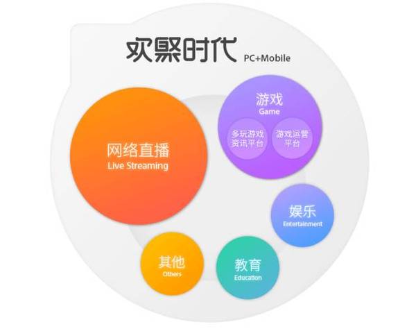 目前,欢聚时代旗下有众多的产品:YY 直播、多玩游戏网、游戏运营平台、YY 音乐、YY 教育、YY 手机客户端、100 教育、虎牙和直播。