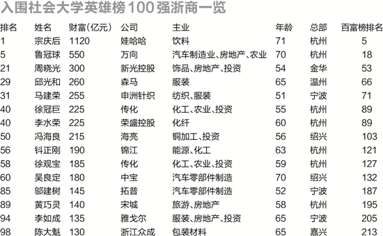导读:昨日,胡润研究院发布《英雄不问出处——2017胡润社会大学英雄榜》,列出了胡润百富榜上前100名没有全日制本科或研究生学历的企业家,宗庆后以1120亿元的身家问鼎,共有15名浙商上榜。