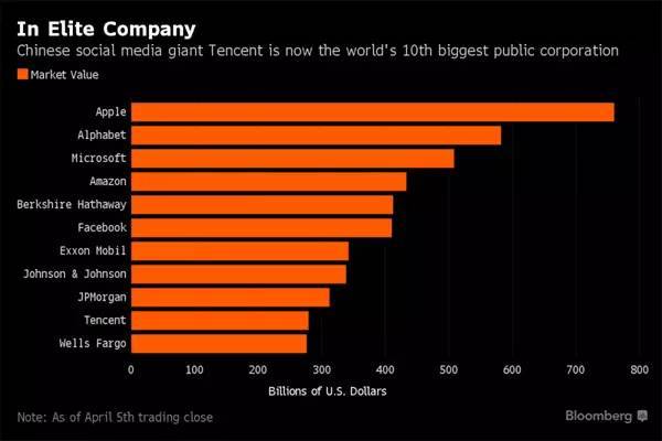 彭博社北京时间4月6日报道,中国科技巨头腾讯周三超越美国富国银行,成为全球第十大上市公司,市值合2790亿美元。