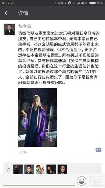 请朋友圈里发表过对乐视对贾跃亭好感的朋友,自己主动拉黑本帝君,无需本帝君自己动手啦。