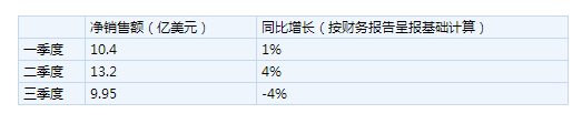 净销售额(亿美元) 同比增长(按财务报告呈报基础计算)