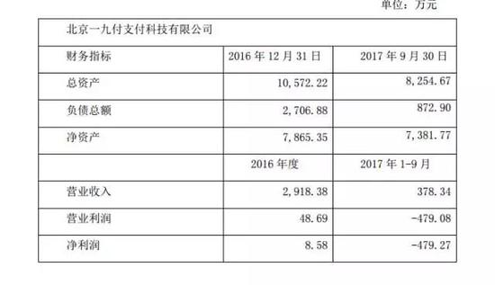 高阳捷迅旗下全资子公司北京一九付支付科技有限公司(下称“一九付”)成立于2010年,2012年6月获得第三方支付牌照,业务主要范围为互联网支付业务。2013年7月,大唐电信(11.680, 0.03, 0.26%)旗下高鸿股份控股一九付,并注资1个亿,一九付成为高鸿股份控股全资子公司,根据公告显示2017年度截至2017年9月30日的净利润为一479.27万元